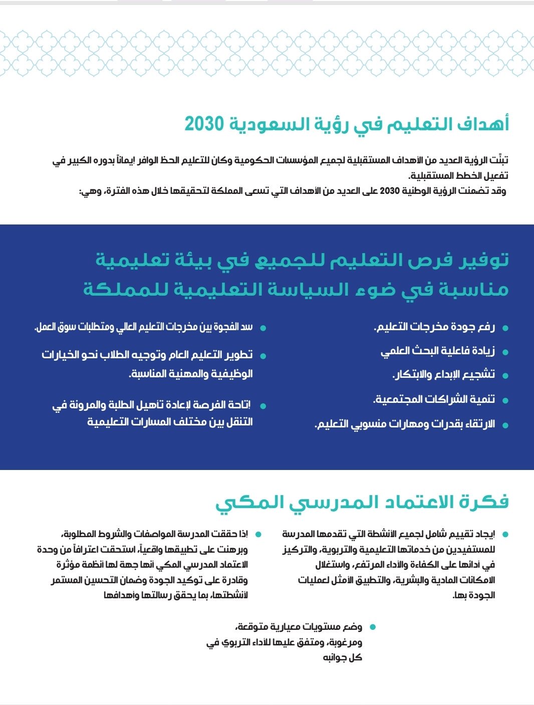 سياسة التعليم واهداف 2030. أشارت الرؤية 2030 سعي المملكة بكافة إداراتها و مؤسساتها التعليمية لسد الف جوة بين مخرجات التعليم و إحتياجات سوق العمل و إستهدفت الرؤية إمكانية أن تصبح خمسة جامعات سعودية على الأقل من ضمن أفضل 200 جامعة عالمية بحلول عام 2030 و من مراجعة أفضل الجامعات على المستوى العالمي. تطوير منظومة التعليم الفني والتدريب لتكون منظومة متكاملة متطورة وفقا لاحتياجات خطط التنمية وسوق العمل. وتهدف رؤية 2030 أيضا إلى إعادة هيكلة قطاع التعليم وصياغة حديثة لمنظومة الأنظمة والتعليمات والقواعد التنفيذية التي تحكم تطوير المناهج والتحاق المعلمين بالسلك التعليمي وتنظيم عملية الإشراف التربوي ورفع فاعلية التطوير والتدريب المهني بشكل مستمر. توفير فرصة التعليم للجميع في بيئة تعليمية مناسبة.